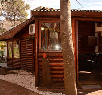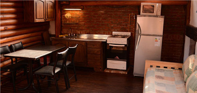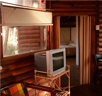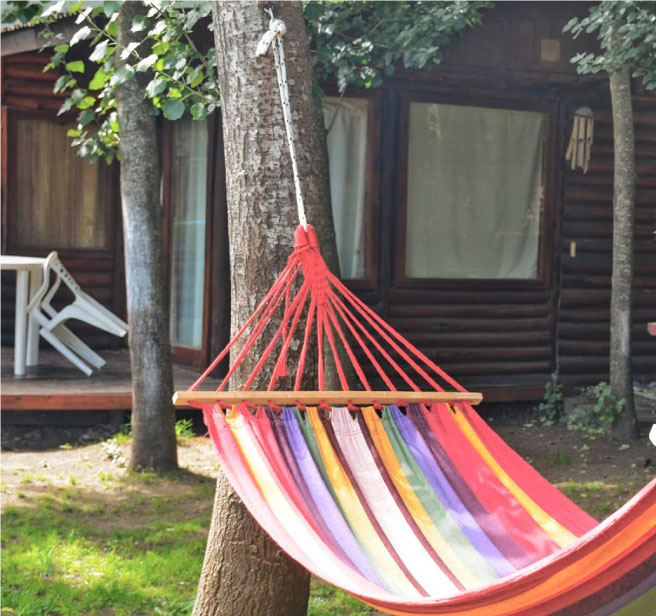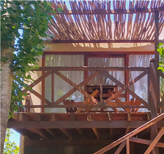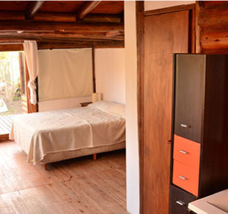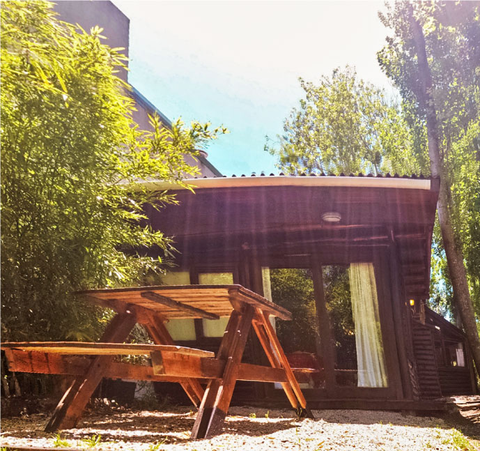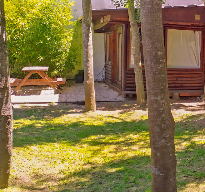 El estilo rústico de la cabaña de troncos invita a una experiencia relajada, ideal para disfrutar del bosque y la playa.
